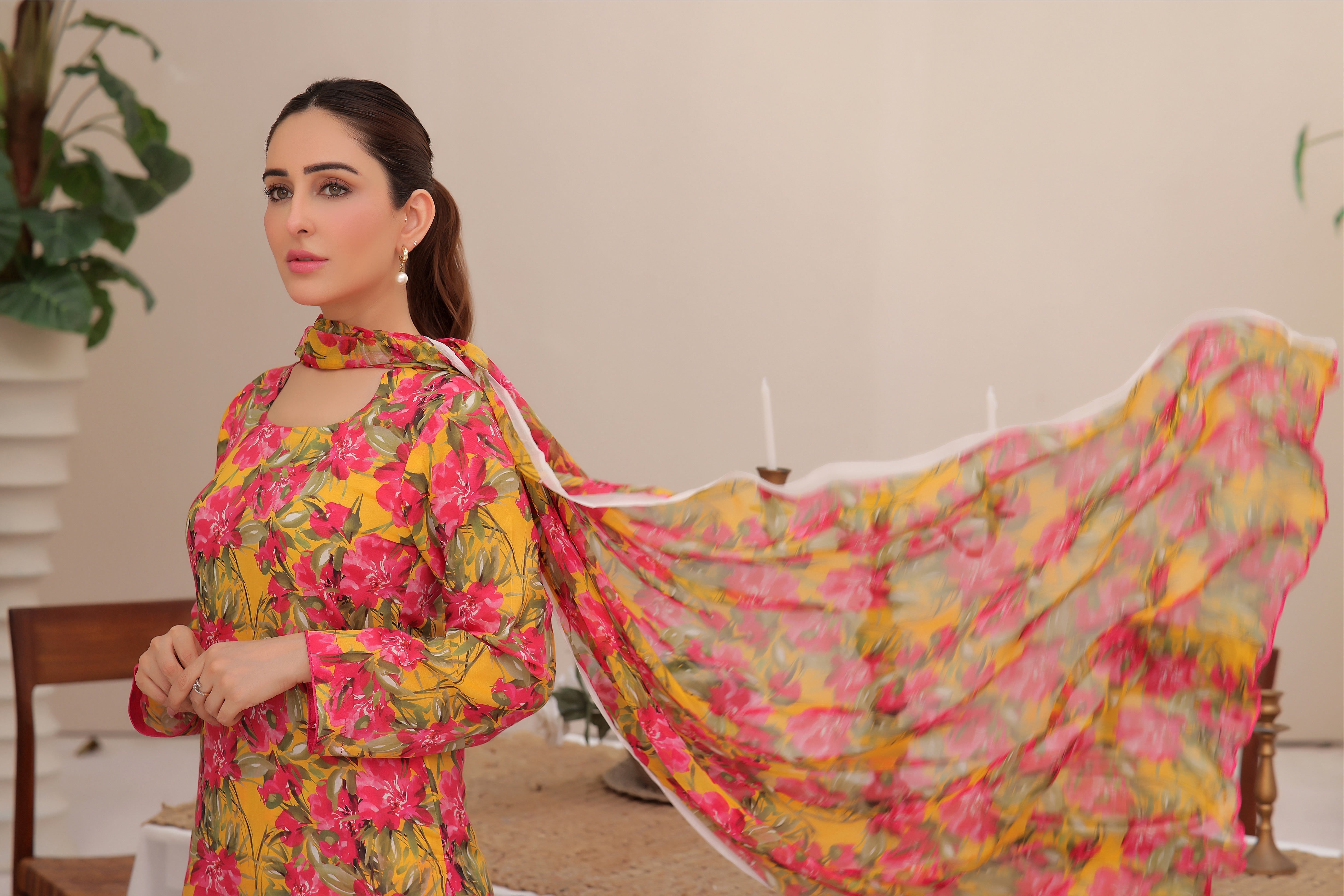 The article includes:Unstitched 3PCDigital Printed Shirt 3 yardsDigital Printed Chiffon Dupatta Digital Printed Trouser 2.5 yards