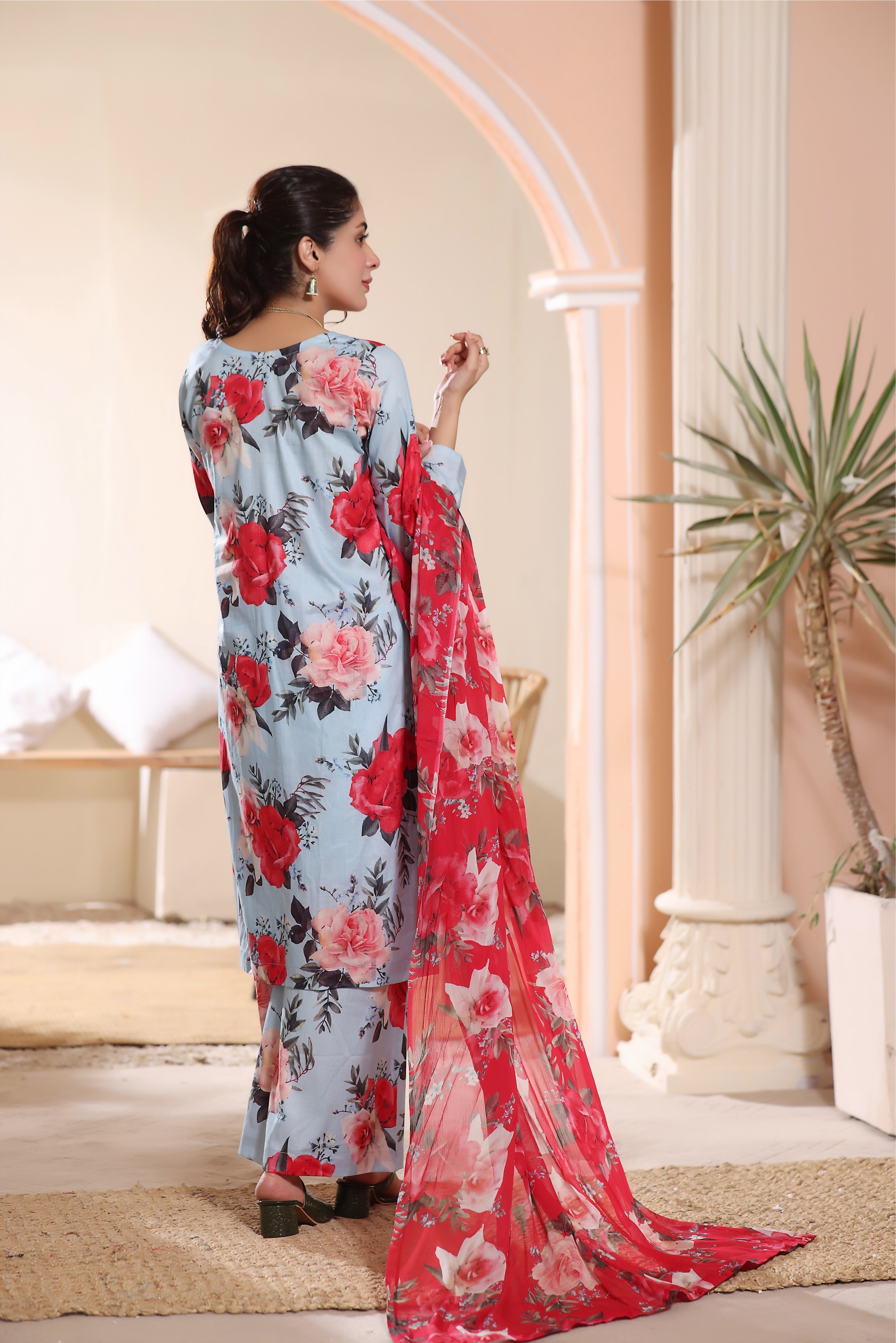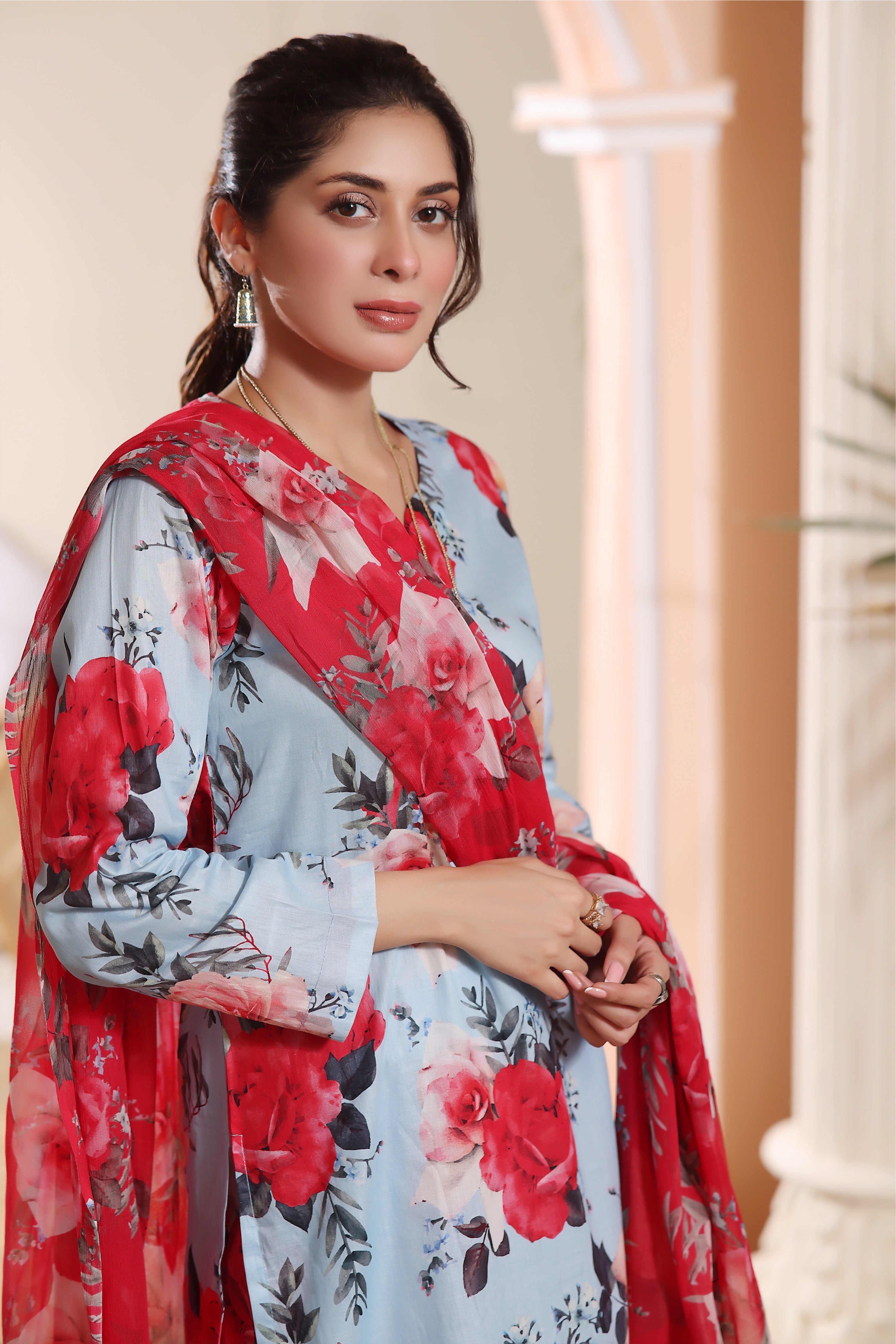 The article includes:Unstitched 3PCDigital Printed Shirt 3 yardsDigital Printed Chiffon Dupatta Digital Printed Trouser 2.5 yards