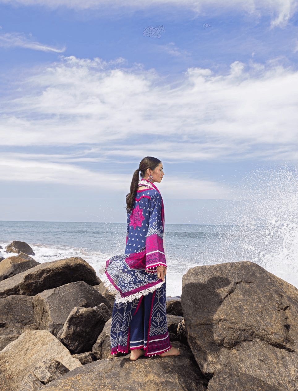 Bandhani presents a contemporary yet classical chunri tales on blue canvas. The printed sleeves are accented with elaborate lattice pattern edged with chunri borders with same pattern reflected as a print on floaty chiffon dupatta.