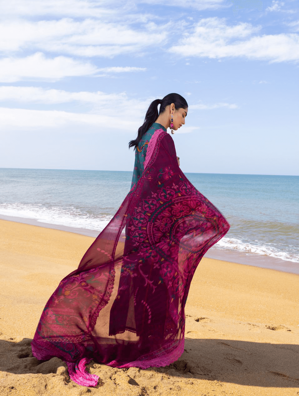 Refresh your summer wardrobe with this absolutely breezy ‘tropic lush’ ensemble with emerald and plum tones. Adorned with embroideries on sleeves and hemline. A floaty plum chiffon dupatta is definitely a want.