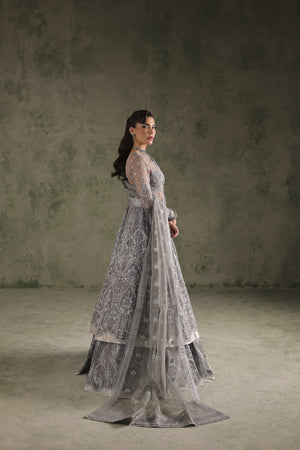 This elegant grey maxi is crafted from embroidered organza with a hand-embellished bodice, adorned with pearls, Japanese cut dana, multi-color crystals, bajra moti, and delicate milky moti accents. The back mirrors the refined embroidery, while embellished sleeves add graceful charm. Featuring 18 embroidered organza pishwas panels, the design flows into a voluminous silhouette. A printed raw silk lehenga with dyed silk lining ensures richness and structure, complemented by a 2.75-yard embroidered organza dupatta. Finished with intricate detailing such as bethki, kulfi, surahi, shelper, and multi-color drops, this maxi is the epitome of luxury; perfect for weddings and grand occasions.