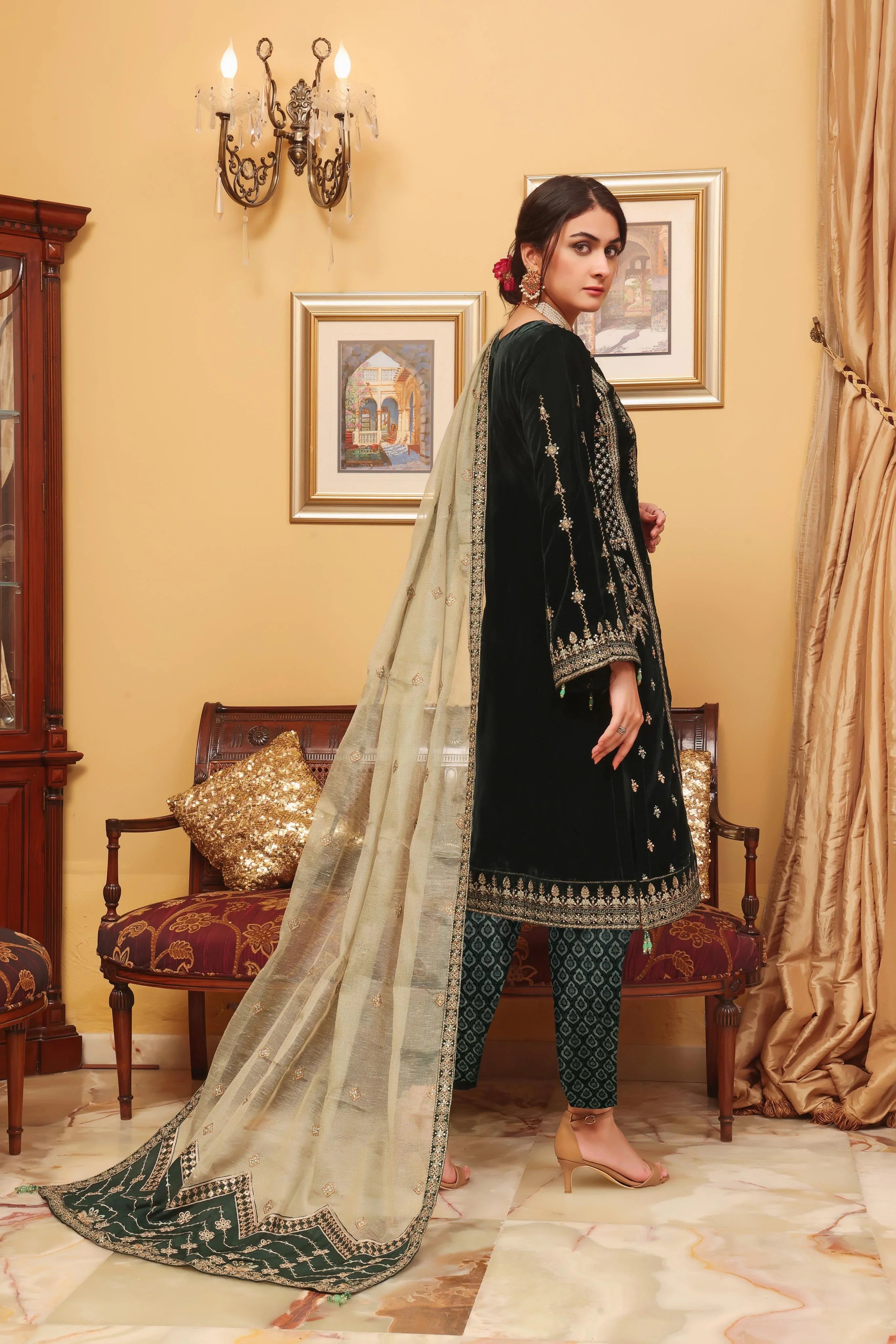 • Embroidered Velvet Dupatta for a regal touch.