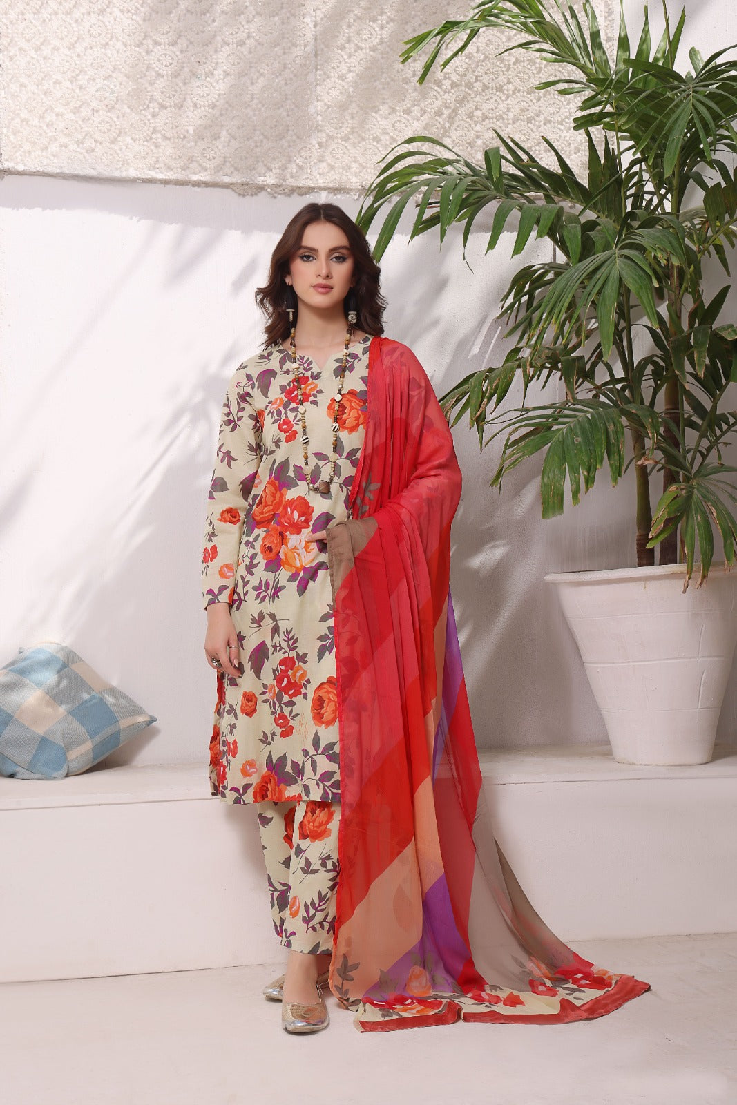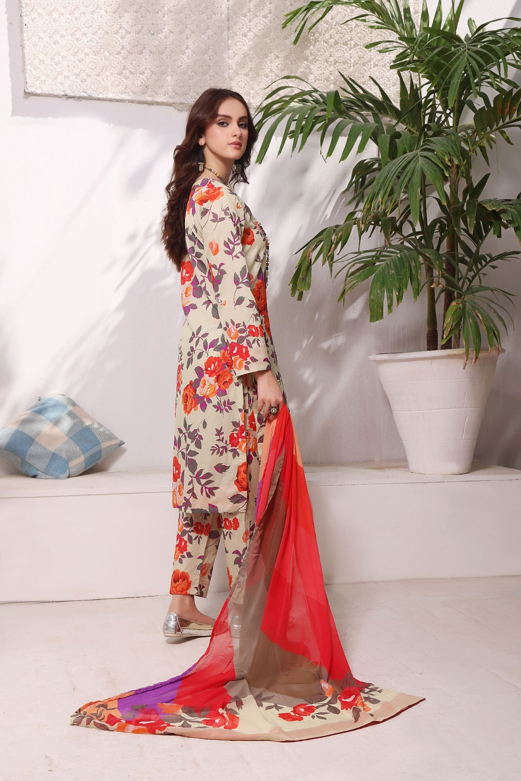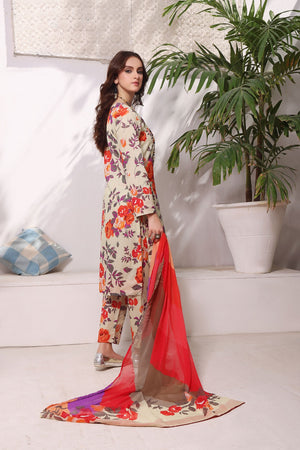 The article includes:Unstitched 3PCDigital Printed Shirt 3 yardsDigital Printed Chiffon Dupatta Digital Printed Trouser 2.5 yards