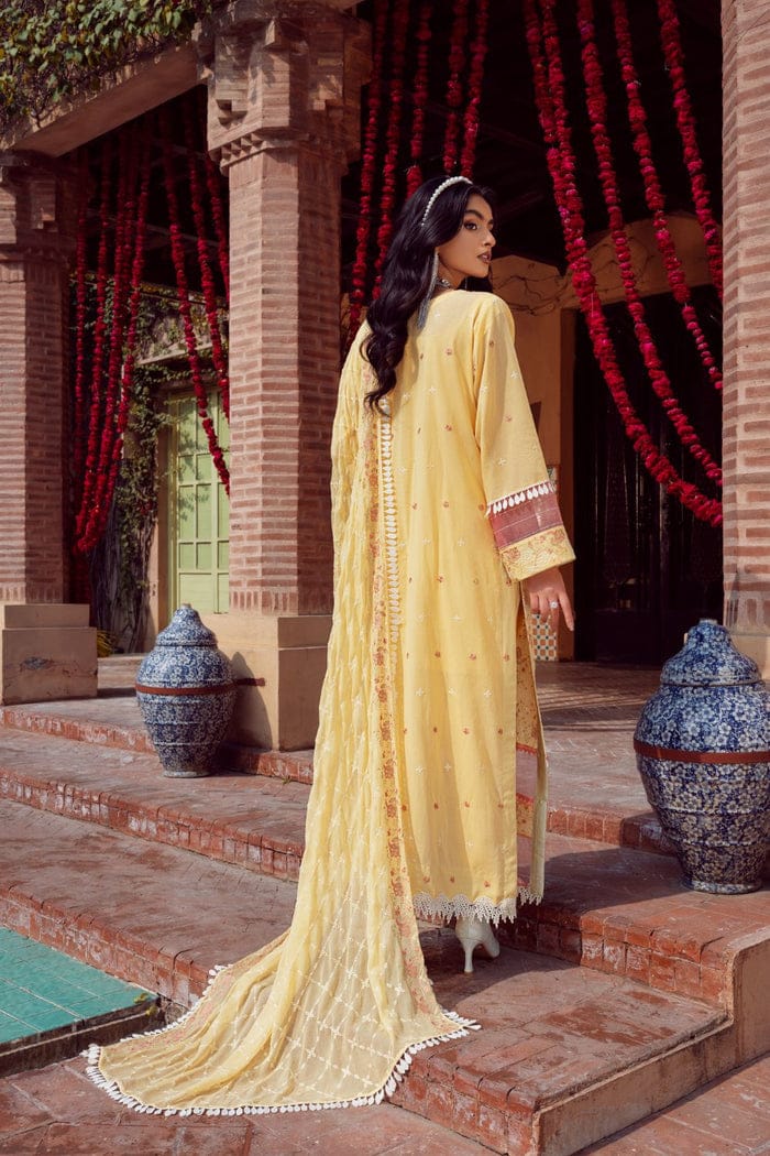 Unstitched 3 piece outfit rendered in traditional embroidery canvased all over a yellow base. Complemented with a plain trouser and embellished dupata.