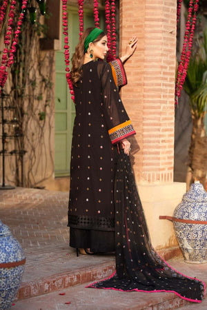 Infused in hues of black featuring meticuluous embroidery layered over front and back, paired with plain bottoms and adorned chiffon dupata.