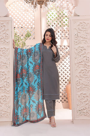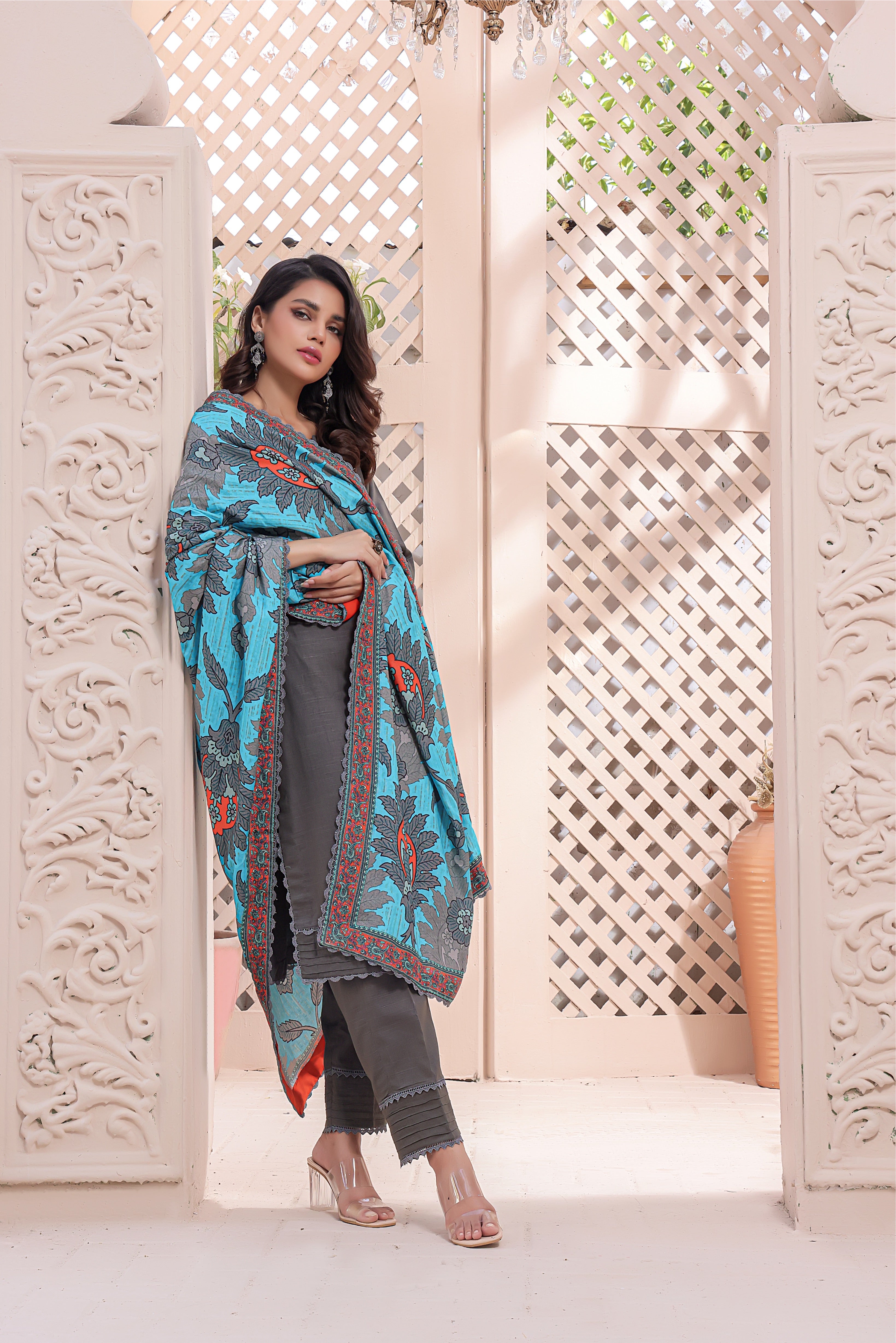 Experience an exquisitely (Unstitched) Digital Printed Karandi shawl with a plain dyed khaddar suit for a new go this winter season.The article includes:Digital Printed Karandi Shawl: 2.5 yardsPlain Dyed Khaddar Shirt & Trouser Fabric: 5.4 yardsDISCLAIMER: COLORS MIGHT APPEAR SLIGHTLY DIFFERENT DUE TO THE PHOTOGRAPHIC/LIGHTING EQUIPMENT USED. SOME ACCESSORIES/EMBELLISHMENTS USED ARE ONLY FOR SHOOT PURPOSES AND NOT PART OF THE ACTUAL SUIT.