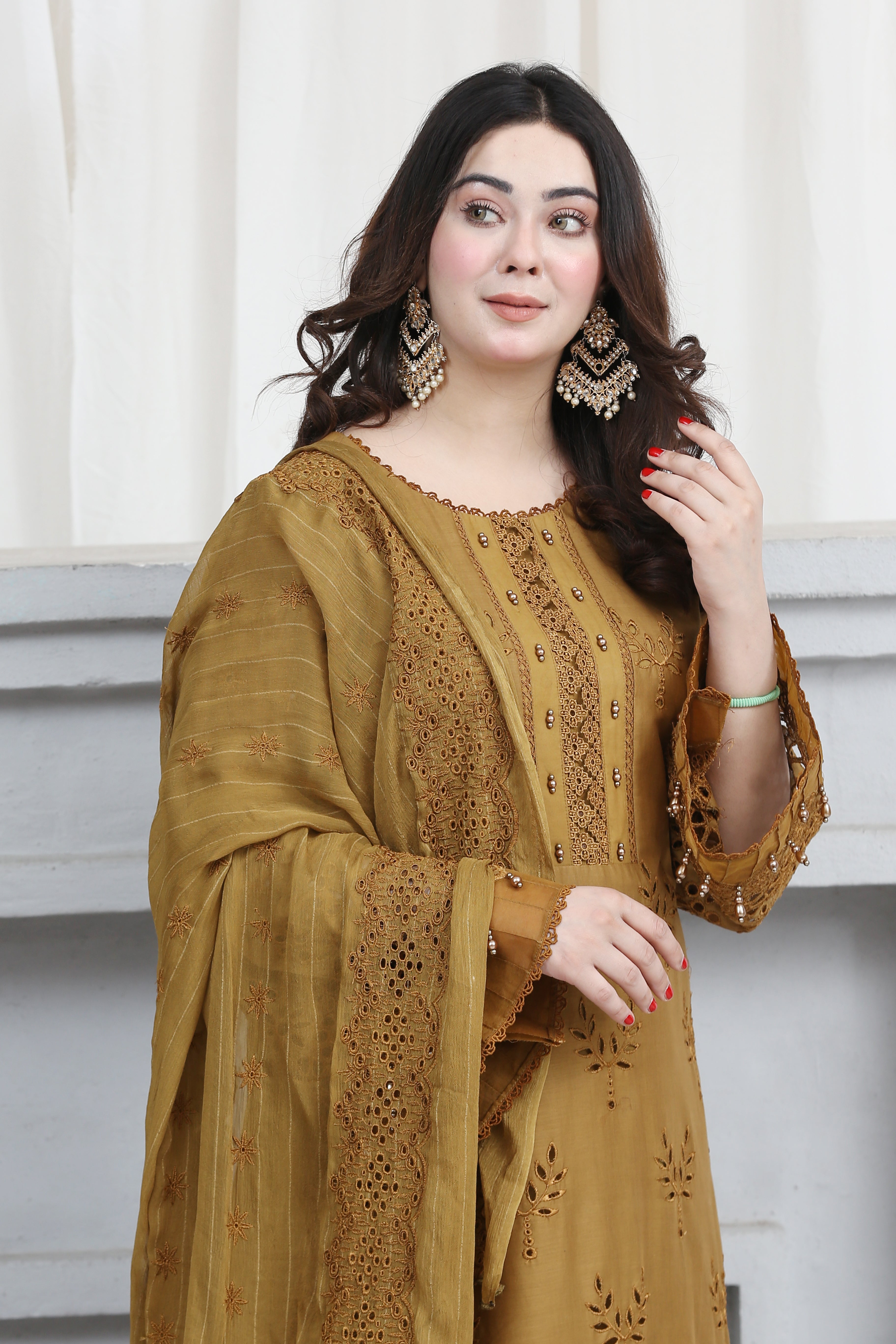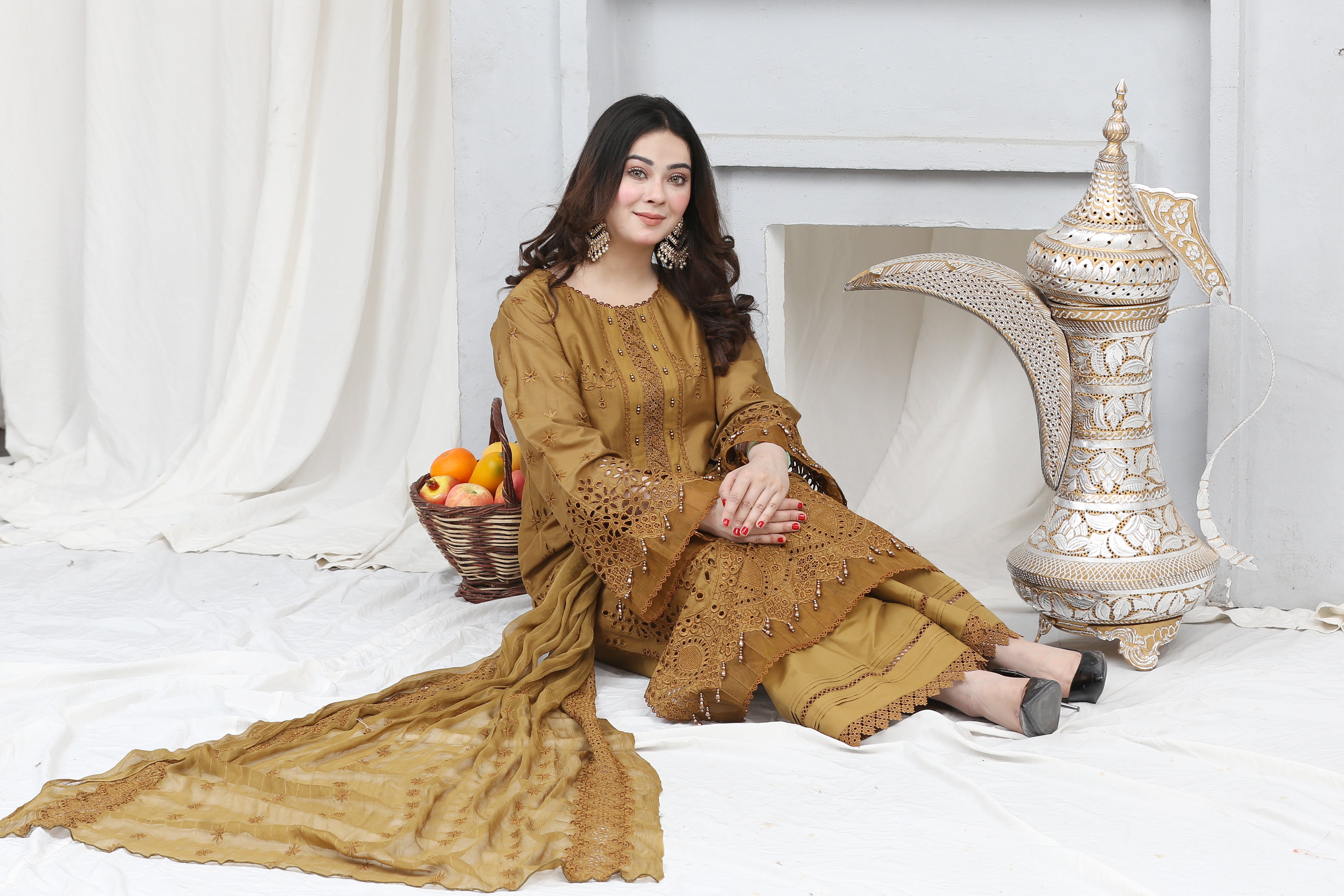 A beautifully embroidered lawn ensemble with back and sleeves, premium chickenkari bimber dupatta, and plain trousers, showcasing Gulposh's quality and craftsmanship.