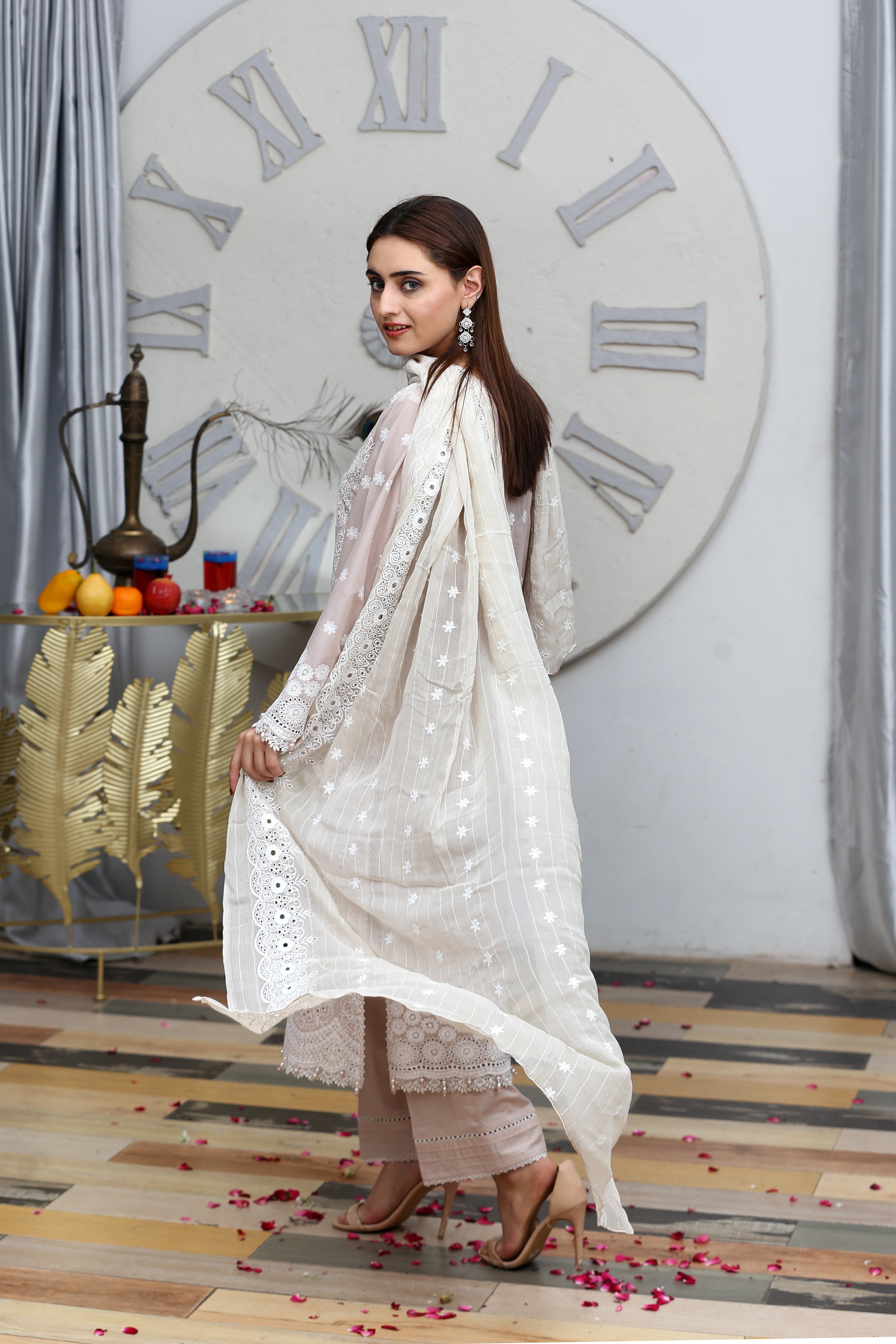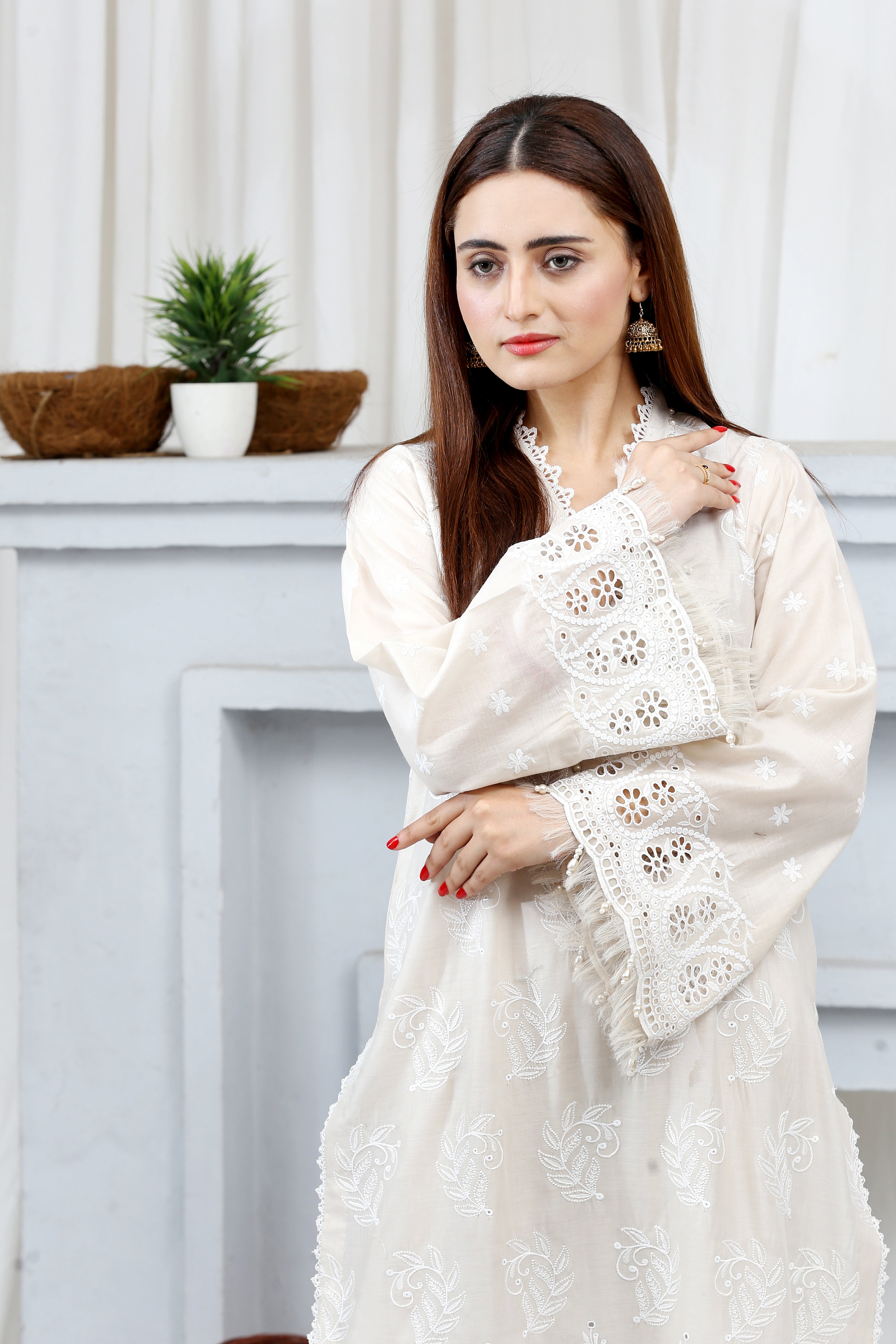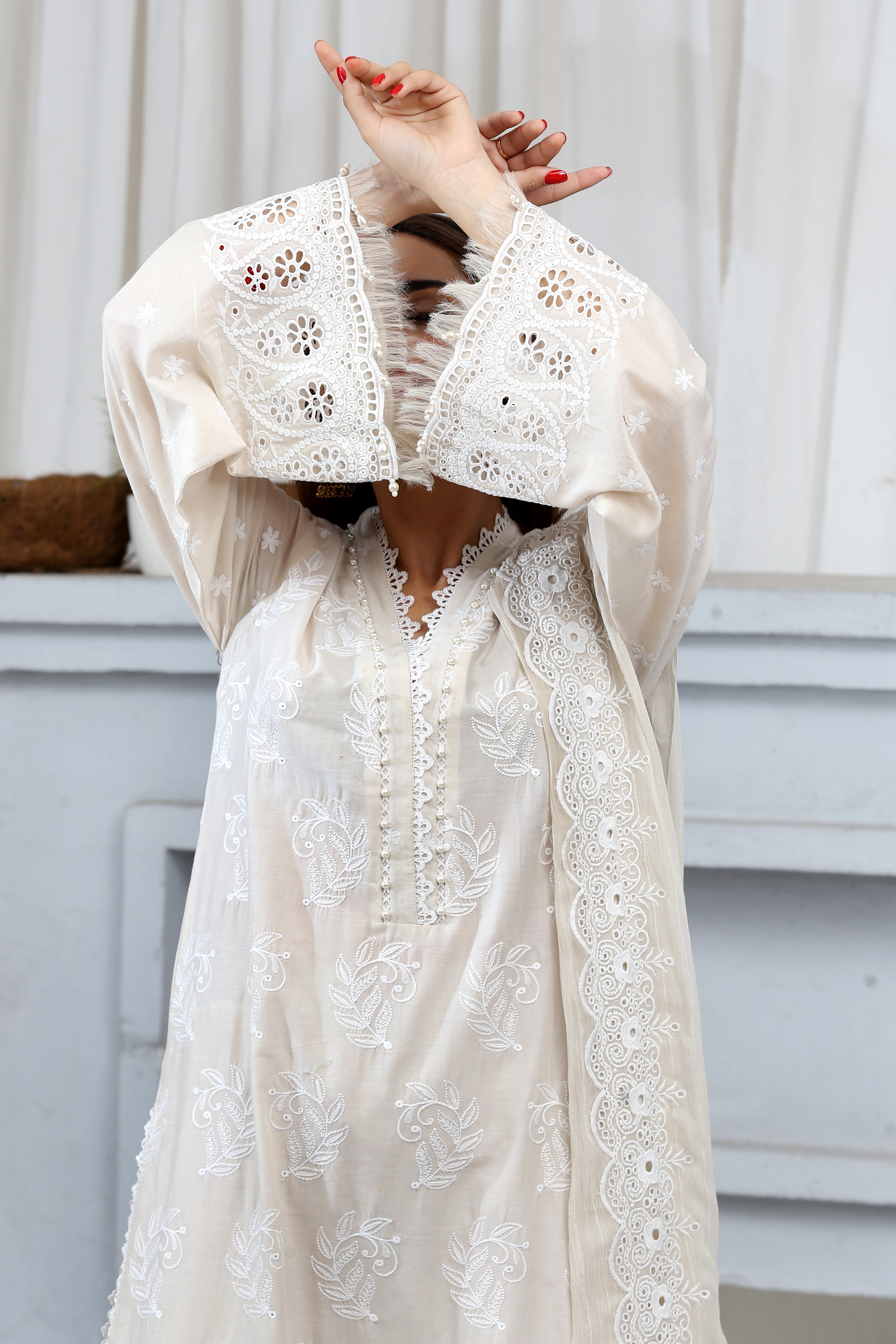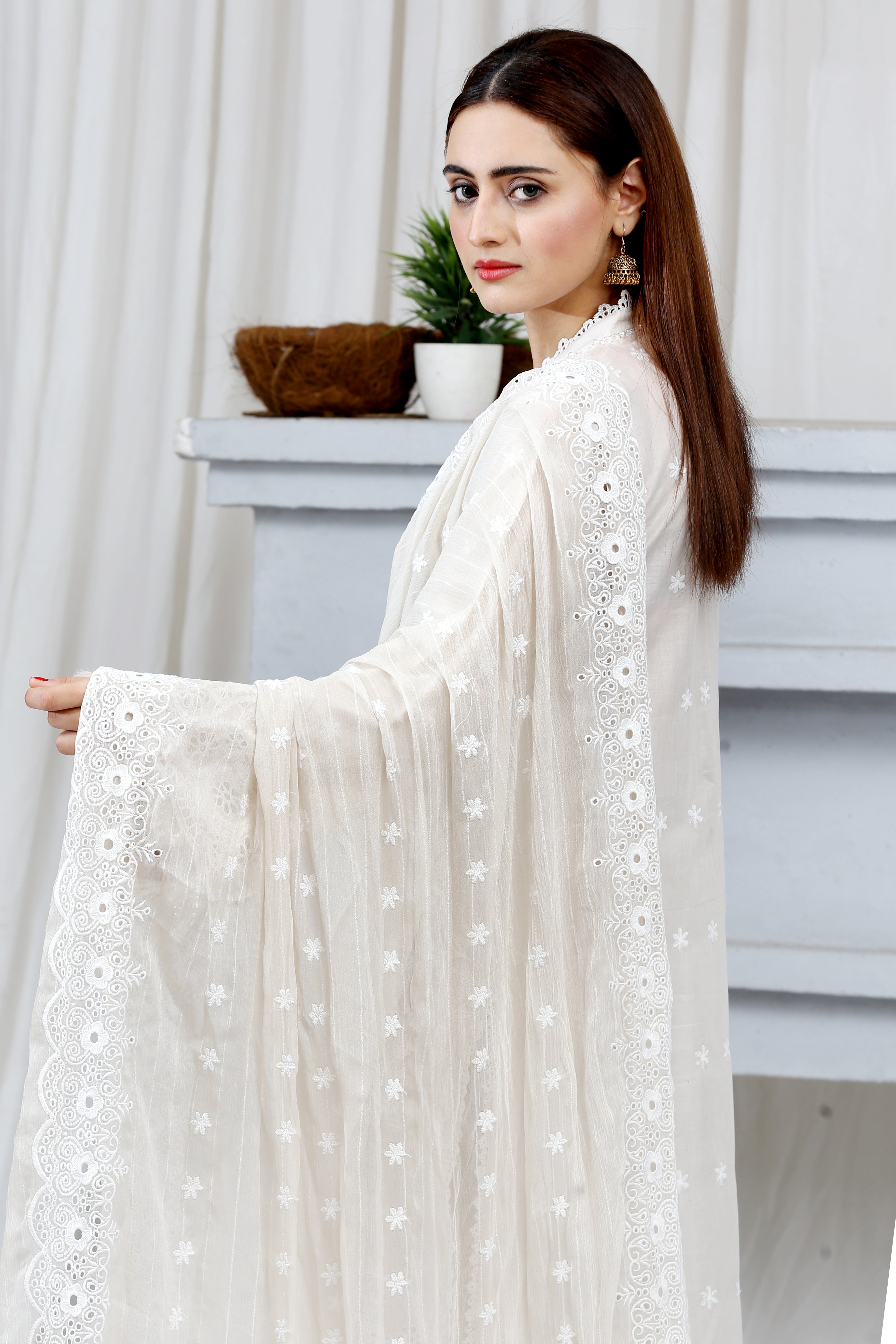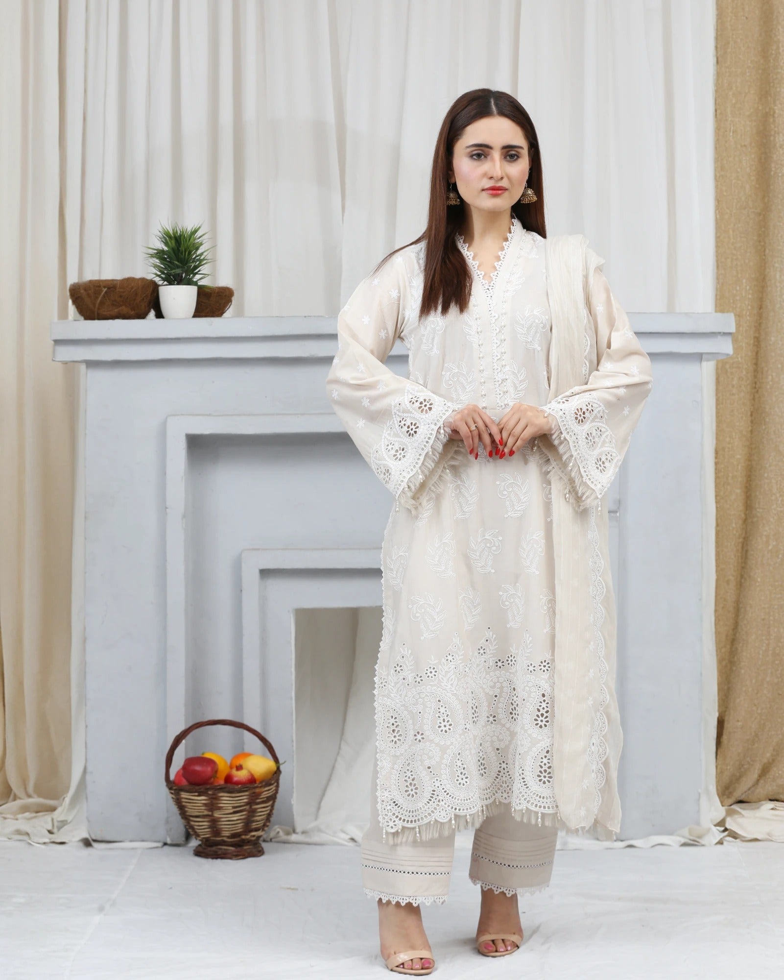 A beautifully embroidered lawn ensemble with back and sleeves, premium chickenkari bimber dupatta, and plain trousers, showcasing Gulposh's quality and craftsmanship.