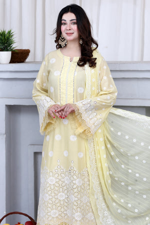 A beautifully embroidered lawn ensemble with back and sleeves, premium chickenkari bimber dupatta, and plain trousers, showcasing Gulposh's quality and craftsmanship.