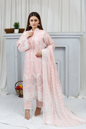 A beautifully embroidered lawn ensemble with back and sleeves, premium chickenkari bimber dupatta, and plain trousers, showcasing Gulposh's quality and craftsmanship.