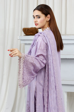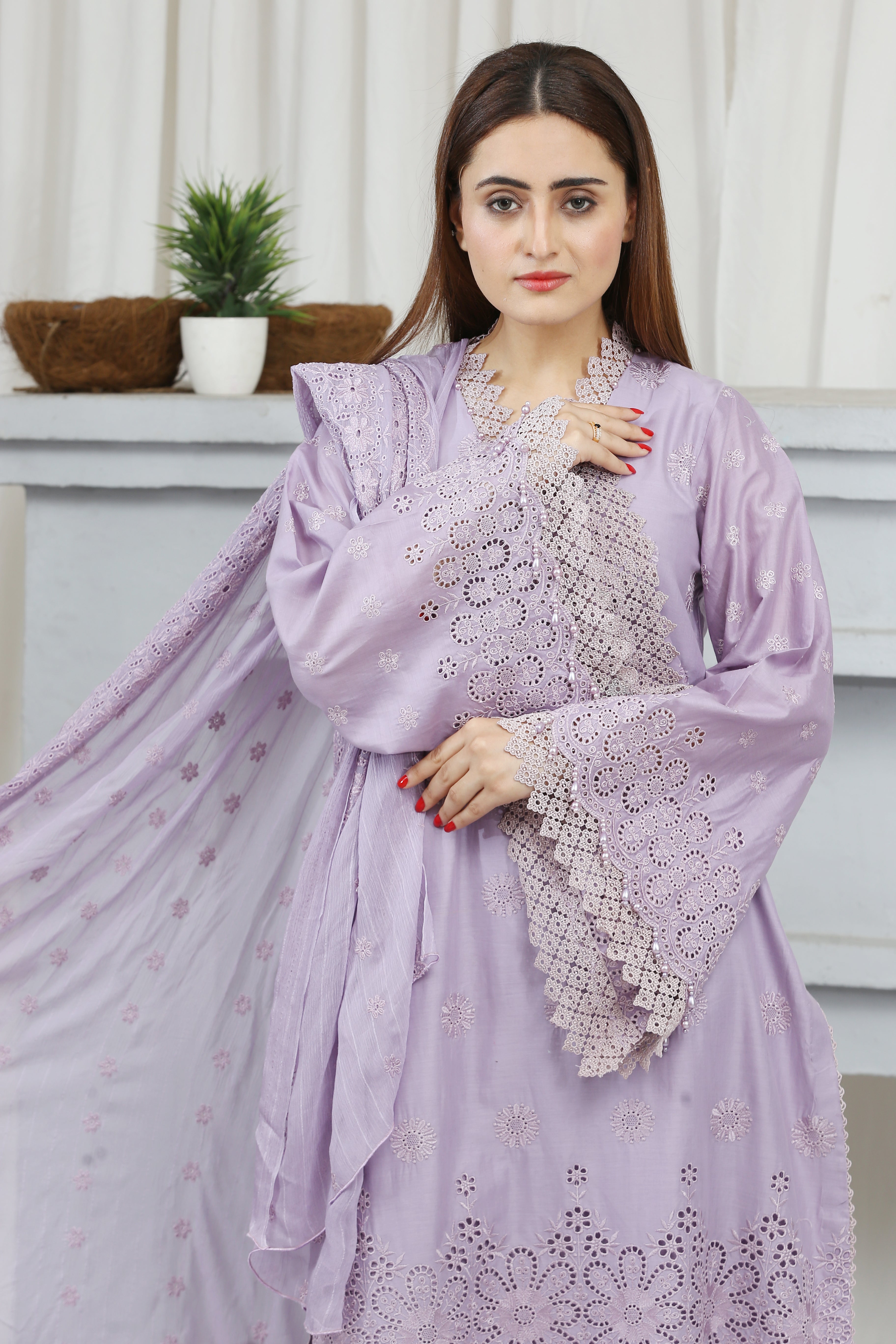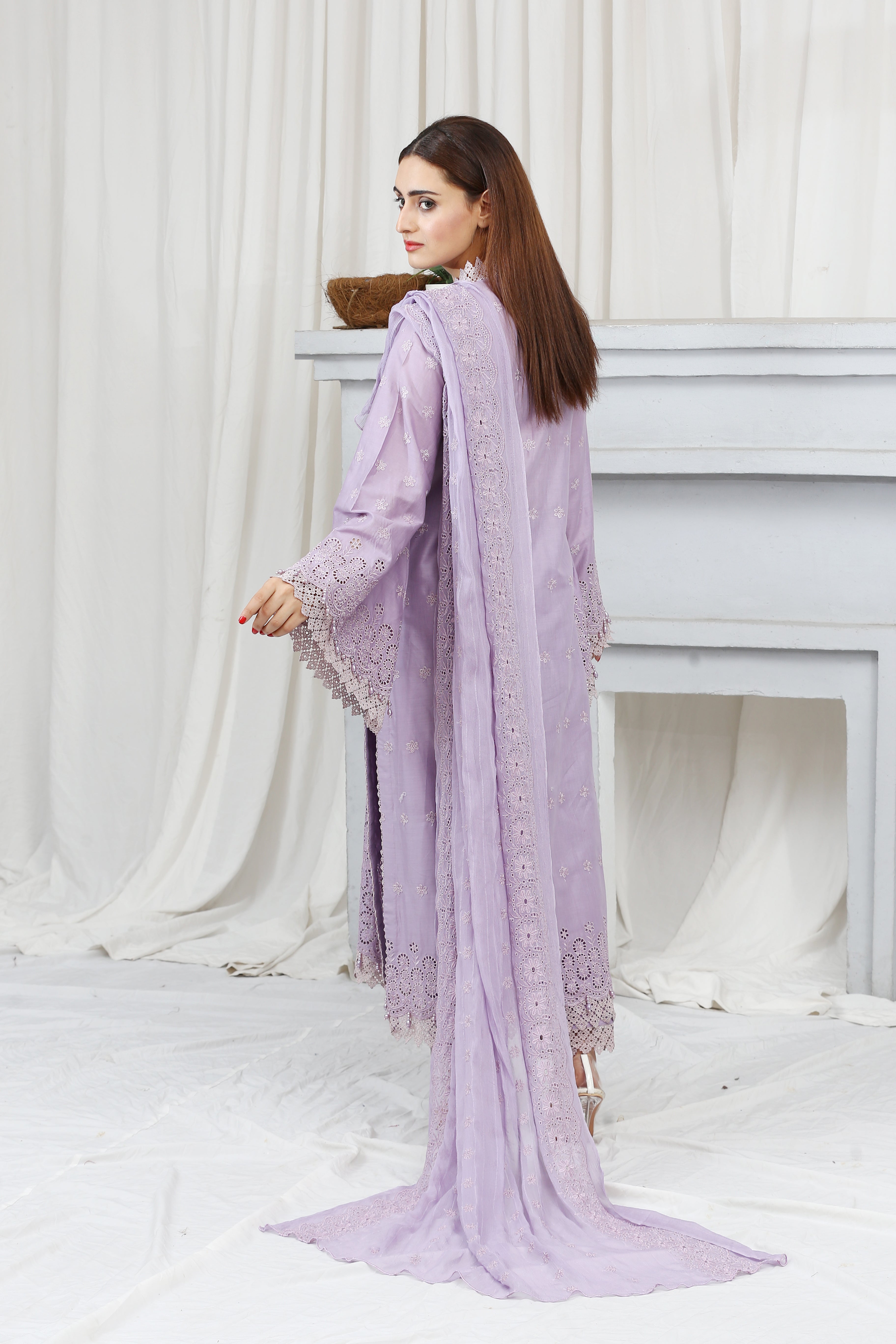 A beautifully embroidered lawn ensemble with back and sleeves, premium chickenkari bimber dupatta, and plain trousers, showcasing Gulposh's quality and craftsmanship.