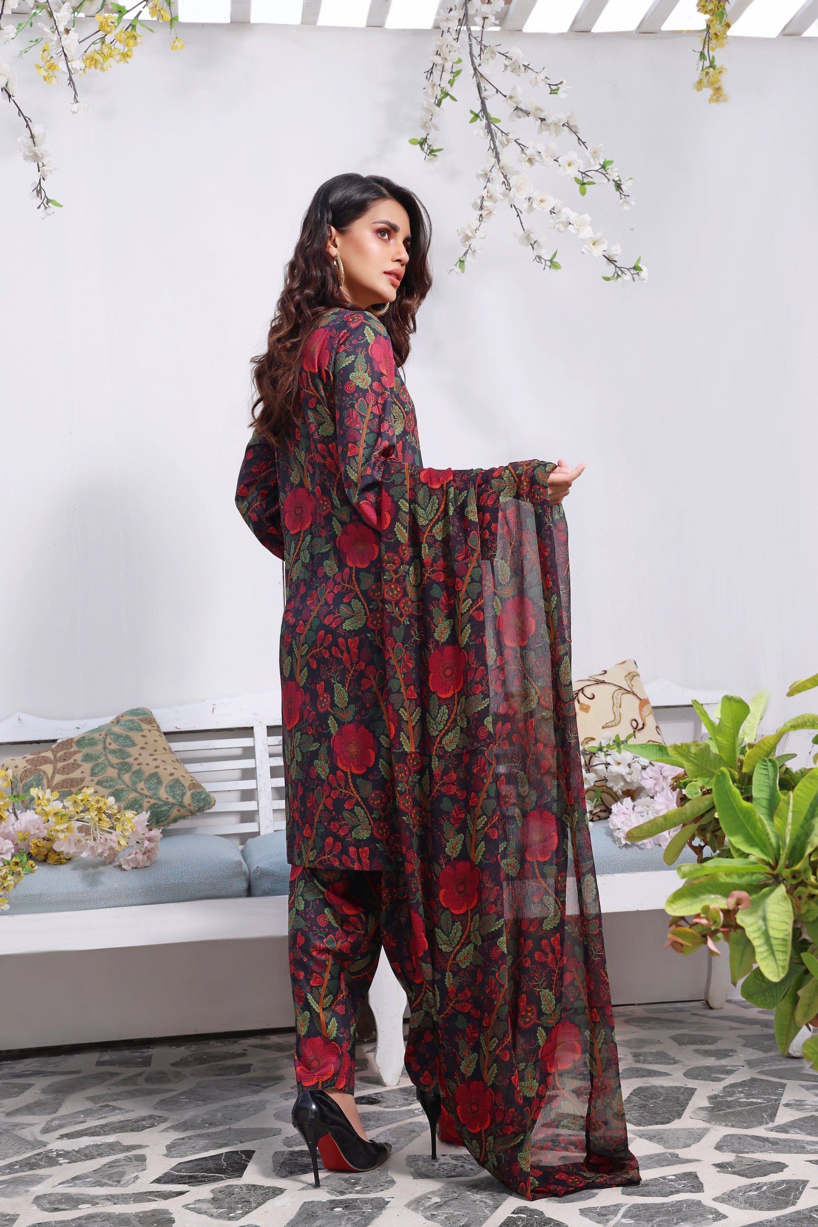 The article includes:Unstitched 3PCDigital Printed Shirt 3 yardsDigital Printed Chiffon Dupatta Digital Printed Trouser 2.5 yards