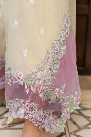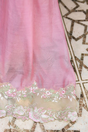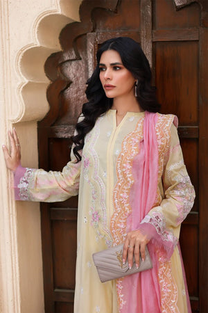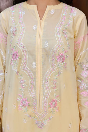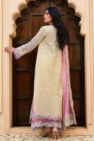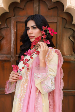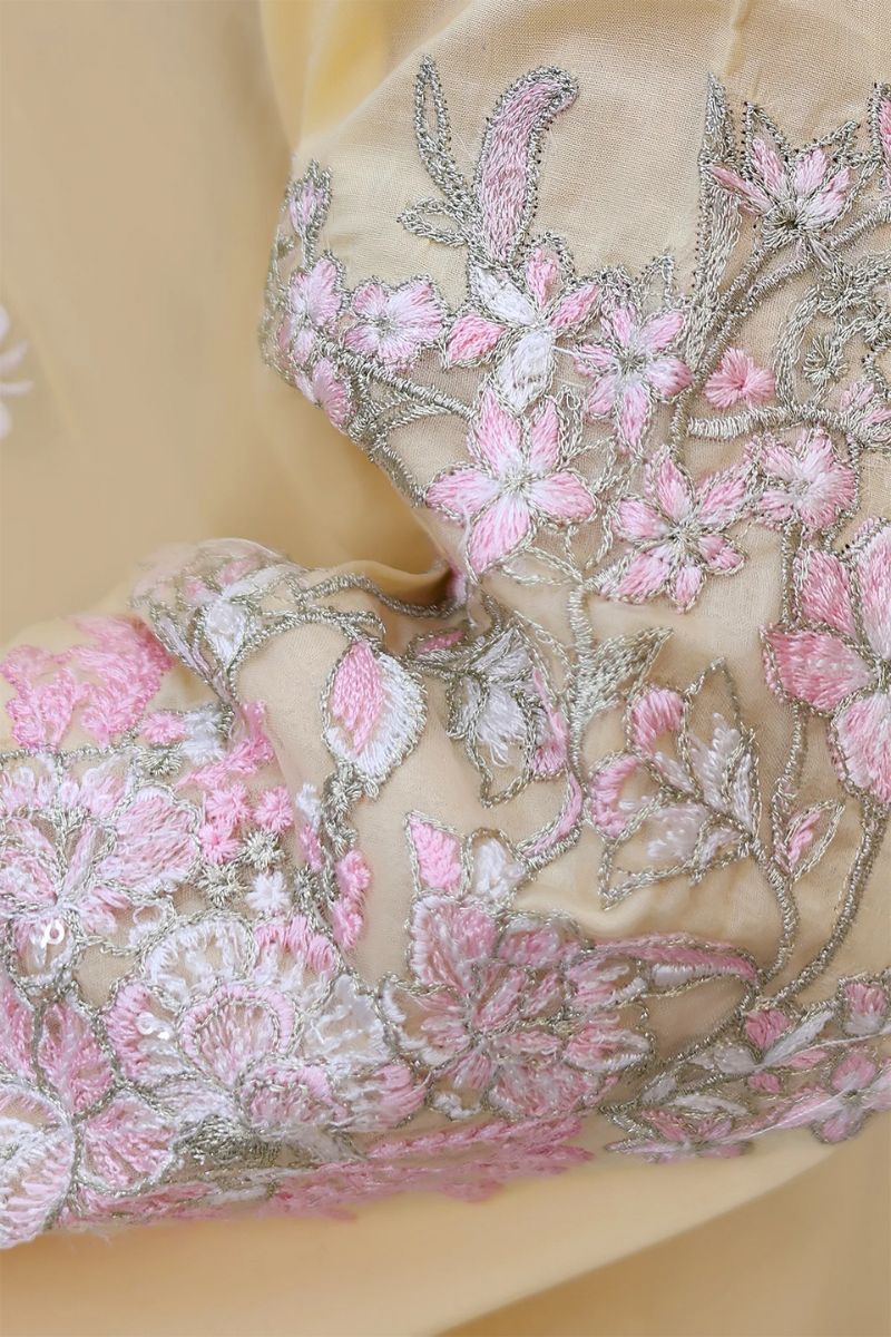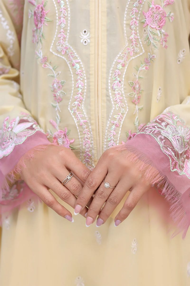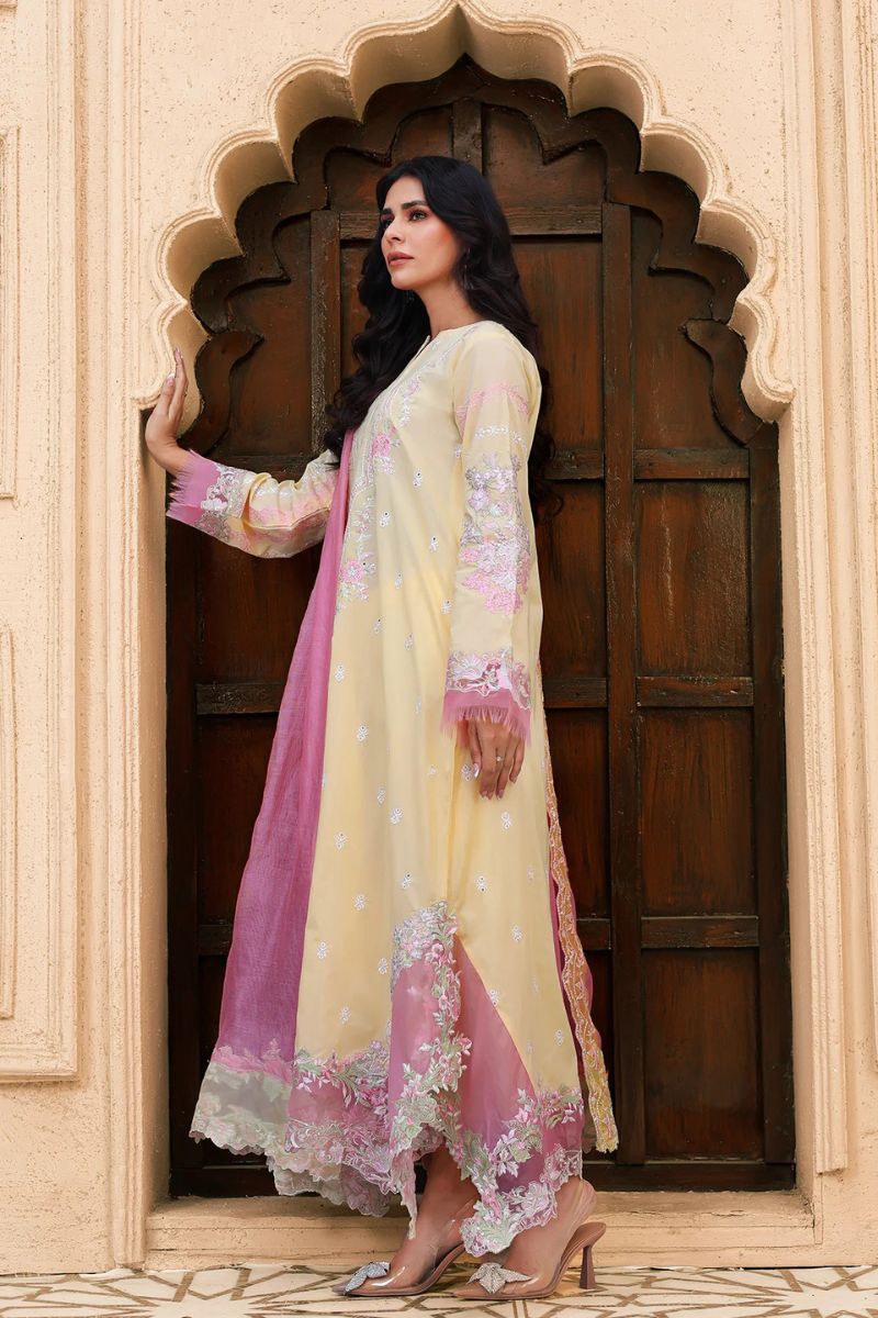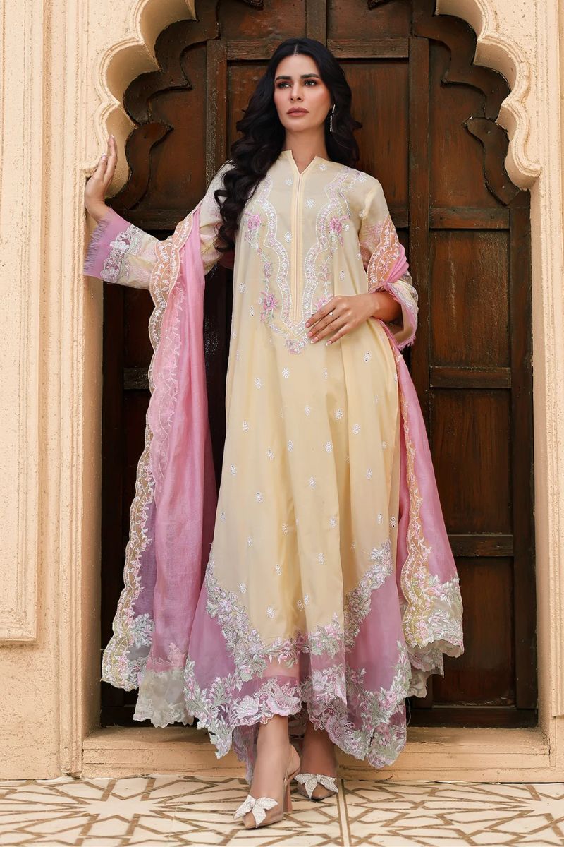 Butter-yellow canvas detailed with pink and white embroidery, layered with sequin shimmer and bold sleeve borders. Finished with a silk dupatta edged on all sides for a rich festive finish.