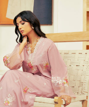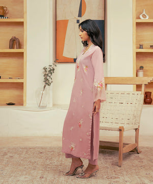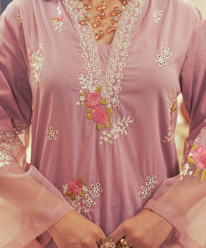 Description: The cotton silk shirt features intricate white cutwork that adds texture and visual interest to the fabric, enhancing the overall look without overwhelming it. Adding a touch of contrast, the contrasting pink rose embroidery is placed on the front and sleeves, with each rose adding a pop of vibrant, rich pink against the softness of the tea pink background. creating a beautiful garden-like feel, adding depth and character to the shirt. The sleeves are made even more special with organza detailing, which adds a layer of ethereal sophistication. The straight pants are simple and understated, made from a plain fabric to balance the ornate embroidery on the top. The simplicity of the pants creates a modern, sleek silhouette while allowing the focus to remain on the intricately embroidered shirt.