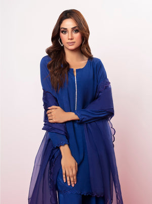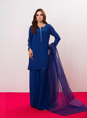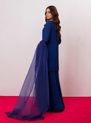 Introducing "Afina" a striking ensemble in navy blue color. Crafted from luxurious raw silk fabric, it creates a harmonious canvas, embodying the essence of timeless sophistication. Adorned with sequins sequins lace on the neckline, front, and back, along with pearl embellishments on the front, which embodies youthful charm and a touch of glamour. Complete the look with matching sharara, making it a perfect choice for the big day.