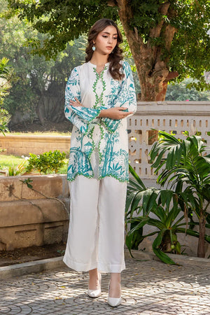 A beautifully printed two-piece featuring intricate floral patterns and a relaxed silhouette. The straight-cut shirt and white trousers offer effortless elegance, perfect for both casual outings and semi-formal occasions.