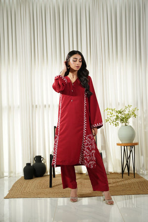 This article consists of a solid 2-piece set with an intricate embroidery detail touch on the shirt. The outfit consists of a long-length style shirt and fitted pants.