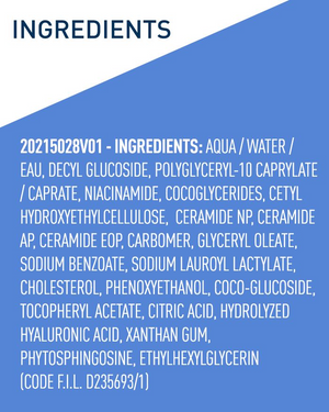 Aqua / Water/ Eau, Decyl Glucoside, Polyglyceryl-10 Caprylate/caprate, Niacinamide, Cocoglycerides, Cetyl Hydroxyethylcellulose, Ceramide Np, Ceramide Ap, Ceramide Eop, Carbomer, Glyceryl Oleate, Sodium Benzoate, Sodium Lauroyl Lactylate, Cholesterol, Phenozyethanol, Coco-glucoside, Tocopheryl Acetate, Citric Acid, Hydrolyzed Hyaluronic Acid, Xanthan Gum, Phytosphingosine, Ethylhexylglycerin.