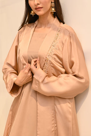 Elevate your basic shirt & trouser to an exquisite ensemble with the combination of a flowy silk shrug decorated with stone & bead work on one side, adding a touch of asymmetric style.