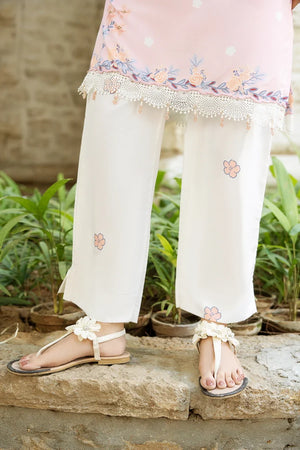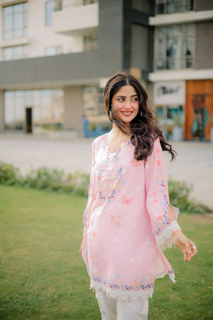 This is a teal printed kurta with a bright garden-inspired floral and butterfly pattern, featuring a decorative scalloped neckline that adds a soft, playful touch. The hem has a matching scalloped border, paired with printed trousers for a coordinated look.