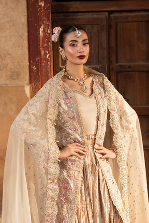 Radiating soft sophistication, Dream Gold from the Ember Collection is an ode to timeless elegance. Crafted on a luxurious zari base in a graceful off-white hue, it features meticulously hand-embellished panels and sleeves, adorned with delicate threadwork, sequins, and refined craftsmanship that shimmer with quiet opulence. The ensemble is paired with an embroidered organza dupatta detailed with intricate pallu borders and a sleek raw silk trouser, a perfect harmony of grace, tradition, and modern refinement.