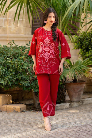 This article consists of a solid 2-piece set with an intricate embroidery detail touch on the shirt. The outfit consists of a long-length style shirt and fitted pants.