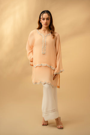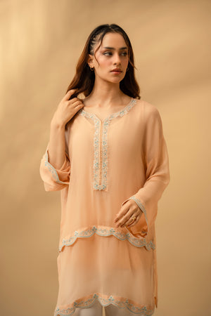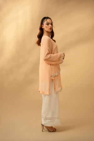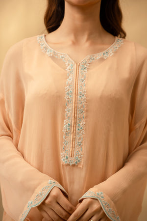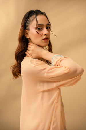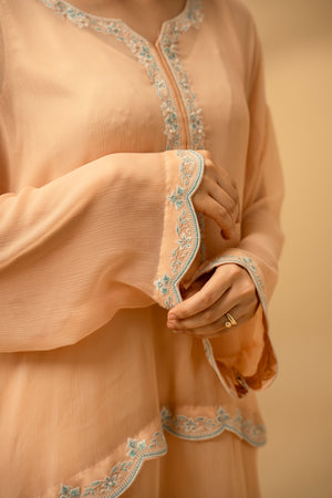 Gossamer is a masterclass in weightless sophistication, designed for the woman who finds luxury in the finest details. This peach-toned ensemble is not merely a garment but an intentional architecture for the self-crafted for delightful gatherings where elegance is felt through every movement. It stands as a tribute to stillness, where soft hues meet the intricate precision of neo-traditional artistry.