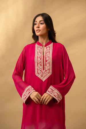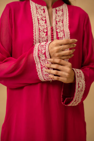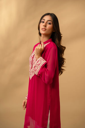 The Sera tunic is a vision in striking magenta, blending a high-impact hue with delicate, ivory-toned artistry. Crafted from a lightweight, breathable fabric that offers a beautiful drape, this shirt features a classic straight-cut silhouette that ensures both comfort and sophistication.