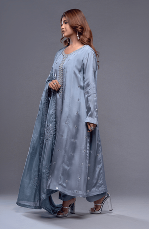 This paneled shirt, finely embellished with stones and sequins, radiates elegance. The dupatta, featuring a unique flower-pattern embroidery, adds a catchy and captivating touch. With its silky texture, this ensemble ensures you look effortlessly graceful and chic.