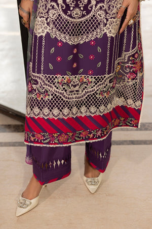 Intricate embroidered chikankari details on the front, side panels, and sleeves, beautifully complemented by organza borders and floral motifs. It is paired with a dyed cambric trouser and a printed chiffon dupatta, creating a sophisticated and graceful look.