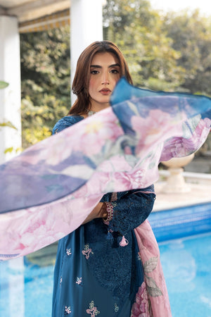 Featuring intricate embroidered chikankari details on the front, neck, and sleeves, beautifully complemented by organza borders. It is paired with a dyed cambric trouser and a stunning silk-printed dupatta.