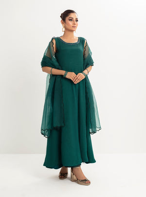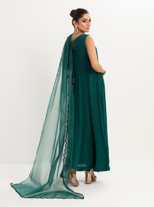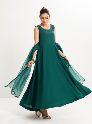 Introducing "Jade" ensemble designed to captivate hearts. This stunning panelled frock-style dress, crafted from luxurious dark green silk fabric, features a sleeveless design perfectly paired with matching bottom, adding a modern twist. Adorned with delicate sequins lace on the neckline, front, and back, along with a fancy tassel at the back, it embodies youthful charm and a touch of glamour.