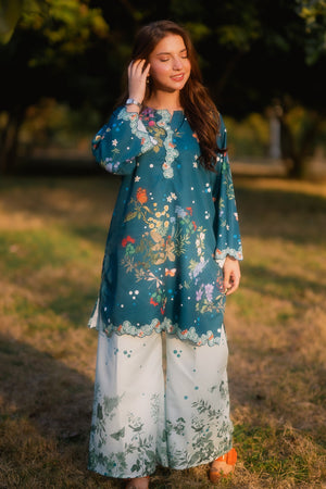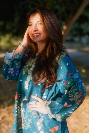 This is a teal printed kurta with a bright garden-inspired floral and butterfly pattern, featuring a decorative scalloped neckline that adds a soft, playful touch. The hem has a matching scalloped border, paired with printed trousers for a coordinated look.