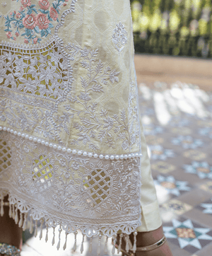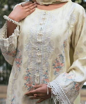 A breathtakingly elegant Basant has refined embroidery, adds a touch of opulence, while the breezy silhouette ensures comfort. With a sheer dupatta and matching trousers, this suit is perfect for festive and formal occasions.