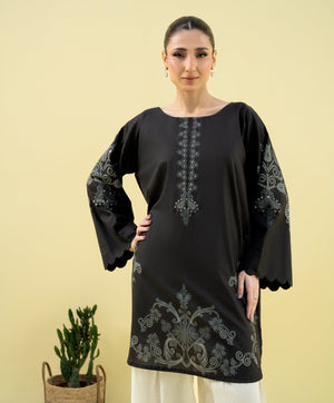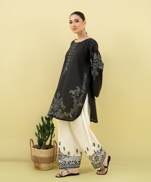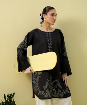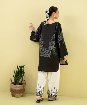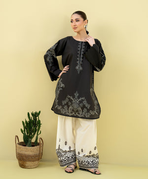 (hand embellished: metallic sequins threaded with multi colored threads on neckline and sleeves). 2 pc printed plus hand embellished set with round hem short shirt and printed farshi shalwar. Fabric : Cambric (cotton). Color: Dark Chocolate.