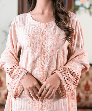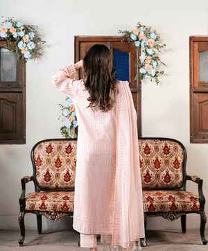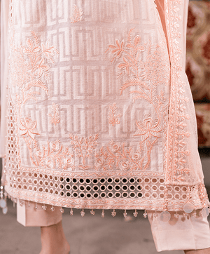 Gulaab is a dreamy, soft peach suit adorned with delicate floral embroidery. The airy fabric and intricate detailing add an ethereal touch, while the matching trousers and sheer dupatta complete the look. Ideal for formal occasions, this suit brings femininity and charm to your wardrobe.