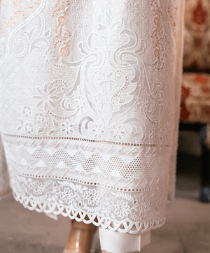Nargis is a delightful fusion of grace and vibrancy. The floral embroidery on the soft fabric creates an eye-catching contrast, while the matching trousers and a flowing pink dupatta complete the ensemble. A charming pick for any festive occasion.