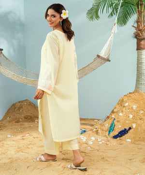 Crafted on breathable dori lawn, this co-ord set showcases linear embroidery and playful contrasting patchwork. Our signature Kaanthaa stitch is carefully incorporated into the design —adding depth and artistry. Presented in Yellow, it’s a standout piece from our Monsoon Collection, designed to reflect the vibrant, refreshing spirit of the season.