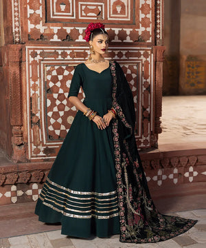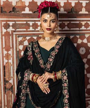 A luxury shawl in emerald green velvet serves as a base to intricate embroidery. It is adroned with hot pink and green resham with gold sequins.