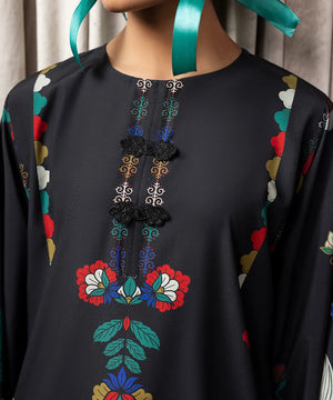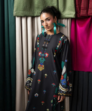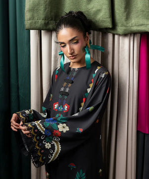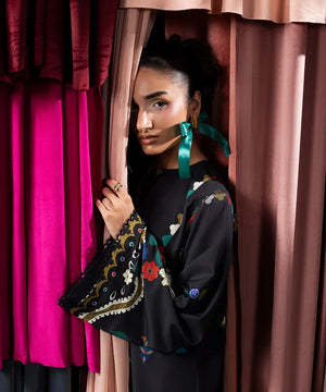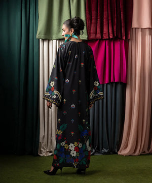 Embrace the beauty of this stunning black kaftan crafted in crepe with a contemporary Suzani print featuring lovely florals, meticulously woven like a poem in multi-colors.
