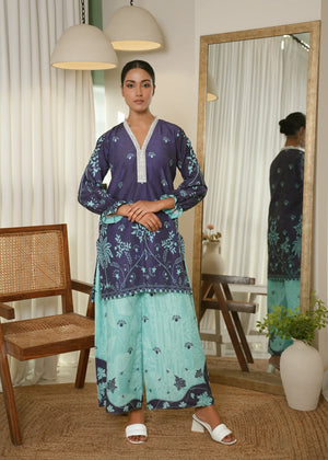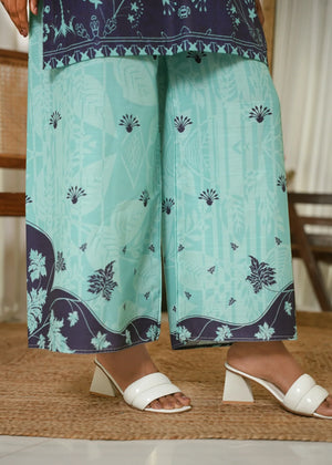 Immerse yourself in the enchanting hues of Midnight Bloom. This captivating 2-piece set pairs a deep indigo shirt with contrasting teal wide-leg trousers for a look that is both bold and harmonious. The design features a nature-inspired print of florals and palms, elevated by a shimmering silver embellished V-neckline and playful ruffled cuffs for a touch of evening glamour.