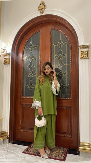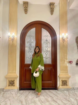 Elevate your style with our exquisite moss green short shirt, beautifully adorned with intricate embroidery that showcases a stunning look. This captivating piece features a flattering silhouette that pairs perfectly with a traditional farshi shalwar, creating a harmonious blend of modern elegance and classic charm.