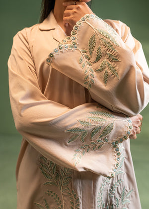 Step into a world of delicate charm with this soft beige co-ord set, adorned with intricate mint-toned floral embroidery and signature scalloped edges. Featuring a classic notched lapel and flowing wide-leg trousers, this ensemble offers an ultra-feminine yet sophisticated silhouette for any formal daytime event