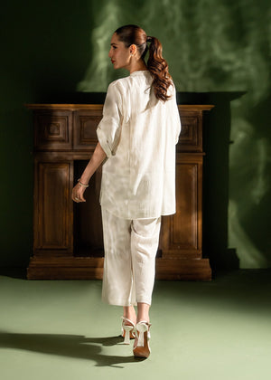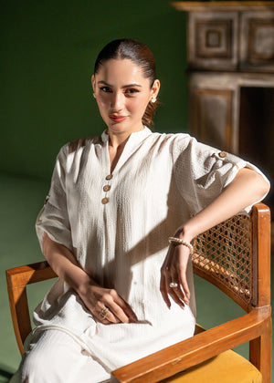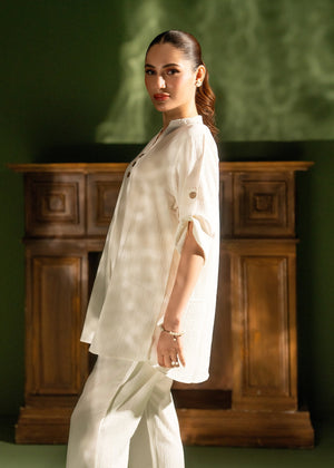 Embrace effortless minimalism with this ivory textured co-ord set, featuring a relaxed-fit tunic with rustic button accents and chic roll-up sleeves. Designed for breezy comfort, this airy two-piece ensemble is a versatile summer essential that brings a touch of "quiet luxury" to your everyday wardrobe.