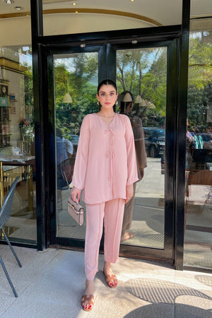 Maintain your class with top Women Pakistani Clothing Brand extra finish work with beautiful pastel color Co-ord sets for daily and casual wear. High quality fabric, detailed work and stitching with pop up of pastel pink shade .