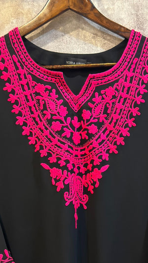 Crafted from luxurious double georgette fabric, this ensemble not only offers a soft, flowing drape but also ensures breathability and comfort throughout the day. The dark black hue adds a touch of sophistication, while the detailed pink embroidery brings a vibrant pop of color, making it ideal for both festive occasions and casual outings.
