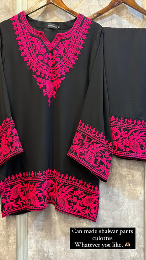 Elevate your style with our exquisite black short shirt, beautifully adorned with intricate embroidery that showcases a stunning look. This captivating piece features a flattering silhouette that pairs perfectly with a traditional farshi shalwar, creating a harmonious blend of modern elegance and classic charm.