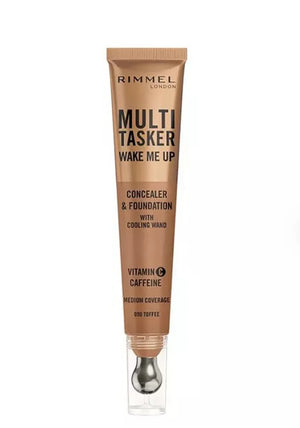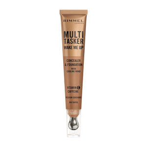 • Energising 2-in-1 Rimmel Multi-Tasker Wake Me Up Concealer & Foundation is perfect for waking up tired skin • A Rimmel concealer and foundation that brightens, corrects and revives skin • Its buildable formula with a radiant finish is infused with caffeine to wake up skin, vitamin C to brighten and even skin tone, and 2% niacinamide for firmer-looking skin • Liquid concealer and foundation with a facial tool-inspired applicator, designed to work in targeted areas or all over the face