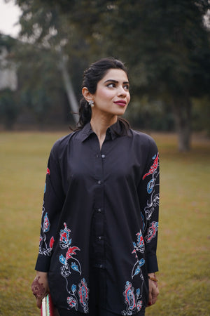The radiant ensemble offers a unique and stylish look for any special occasion. This 2-piece suit features a chic contemporary short shirt with minimal floral prints. The matching trousers make it a trendy outfit to style at fun gatherings.