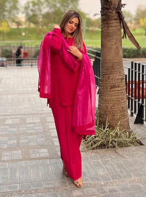Paired with a graceful 3-yard Organza Dupatta, this outfit offers versatility with optional sleeves, allowing you to personalize your style. More than just clothing, it's a bold statement of fearless elegance, inviting you to embrace the vibrant spirit of "Ruby" and leave a lasting impression wherever you go.